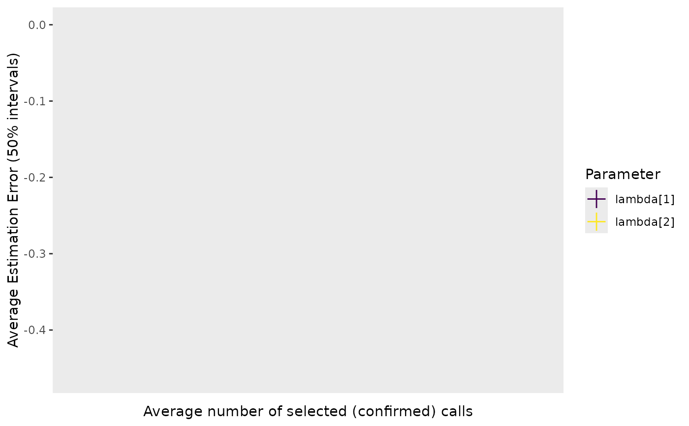 A ggplot2 object showing the number of calls validated on the x-axis and the average estimation error on the y-axis.